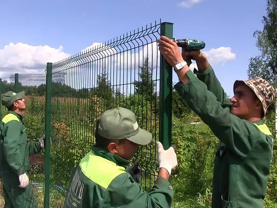 При самостоятельном строительстве изгороди монтаж является частью процесса, который не вызывает затруднения даже у неопытных строителей. Производители выпускают секции одинаковой ширины с готовыми отверстиями для крепления к опорам, так что монтировать забор 3Д можно, как конструктор. К модулям прилагается комплект крепежного материала: скобы, прижимные пластины с гайками и болтами, хомуты. Единственной трудностью может стать наличие на столбе одного ряда отверстий. Второй ряд делается сверлом по металлу с соблюдением углов. Для этой же цели можно применить специальные саморезы.