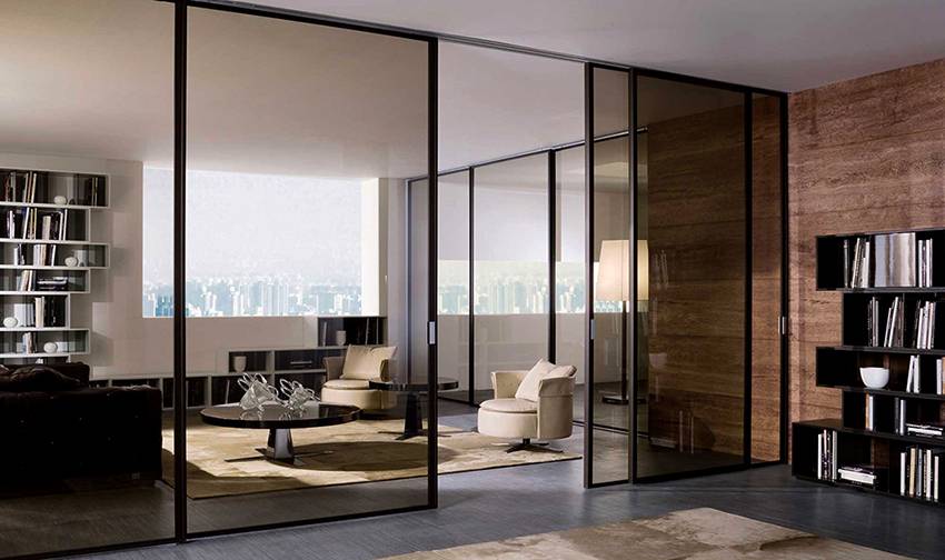 В качестве входных одностворчатые двери чаще используют распашные, открывающиеся на себя, с частичным либо полным стеклянным заполнением. Это может быть закаленное стекло либо многокамерный стеклопакет – в зависимости от того, “холодные” или “теплые” двери требуются заказчику. Если двери ведут в теплое, отапливаемое помещение, то она должна быть выполнена из теплого алюминия. В качестве межкомнатных можно установить одностворчатые сдвижные двери, перемещающиеся по параллельным направляющим для освобождения проема.
