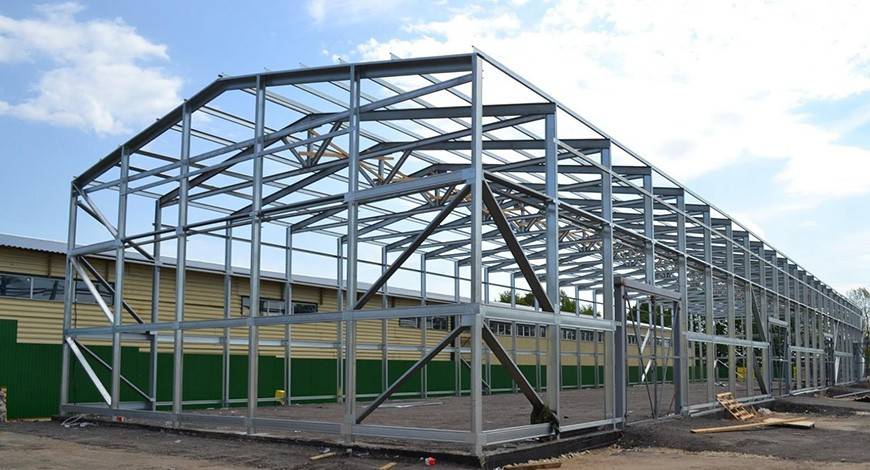 - Установка каркаса из металлопрофиля. Каркас крепится к фундаменту и оформляется по всей площади возводимого сооружения. В случае, если используется бескаркасный способ, первым делом создаются торцевые элементы и ворота.