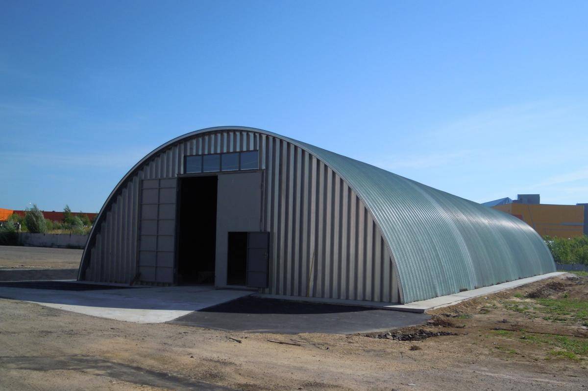 Одной из наиболее распространённых видов ангаров считается арочная конструкция. Её основным достоинством является то, что она самая выгодная с точки зрения расхода необходимого материала. Дело в том, что внешняя нагрузка на стенки распределяется по касательной к поверхности и позволяем применять металл более тонкий, что и сказывается на цене самого материала.