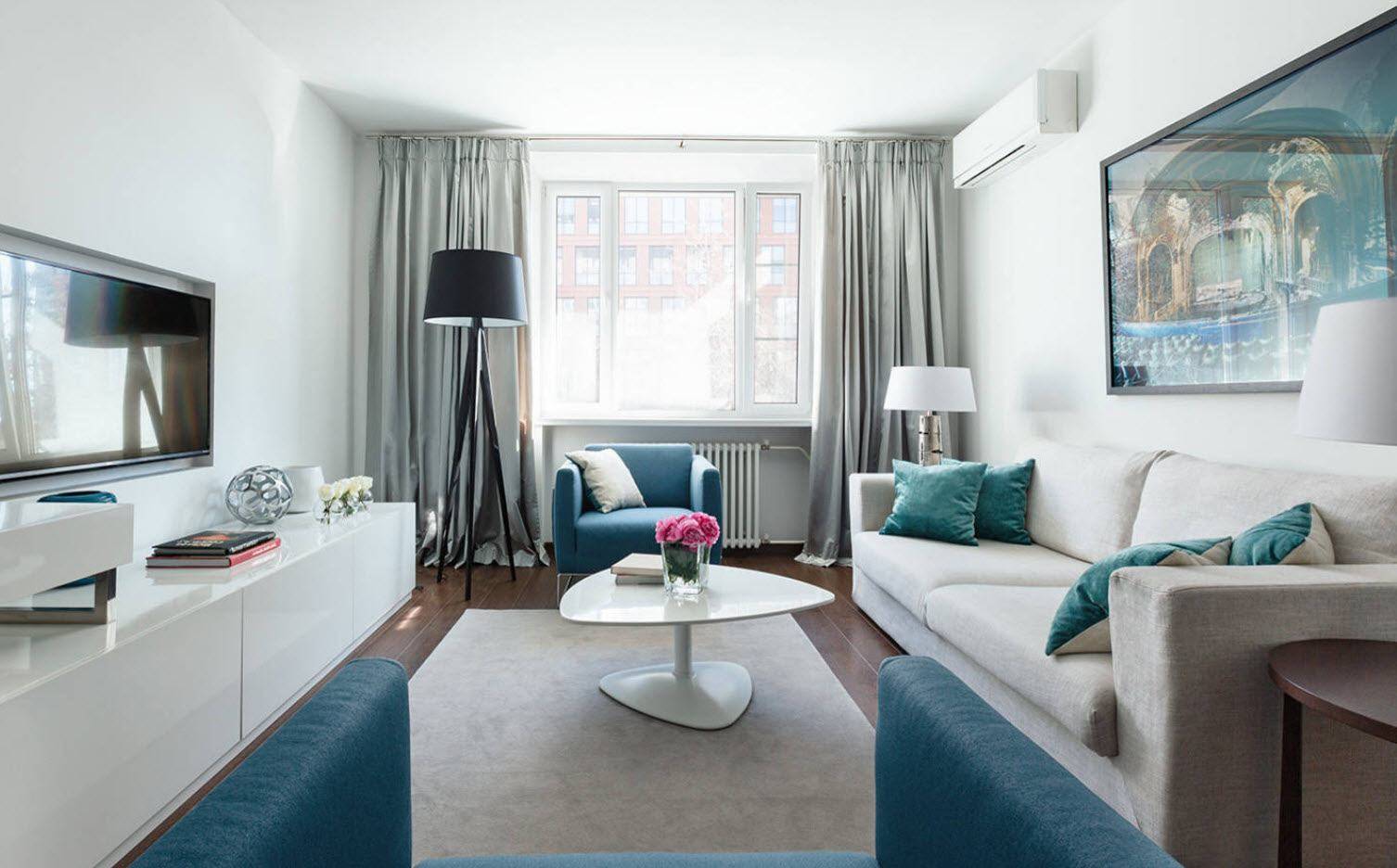 Говоря о подходящих цветовых сочетаниях для маленькой гостиной с белыми стенами, вполне допустимо и введение холодных (синяя гамма тонов), как на фотографии нашей гостиной «после». Главное чтобы их участие прослеживалось только в деталях и не выходило на передний план.