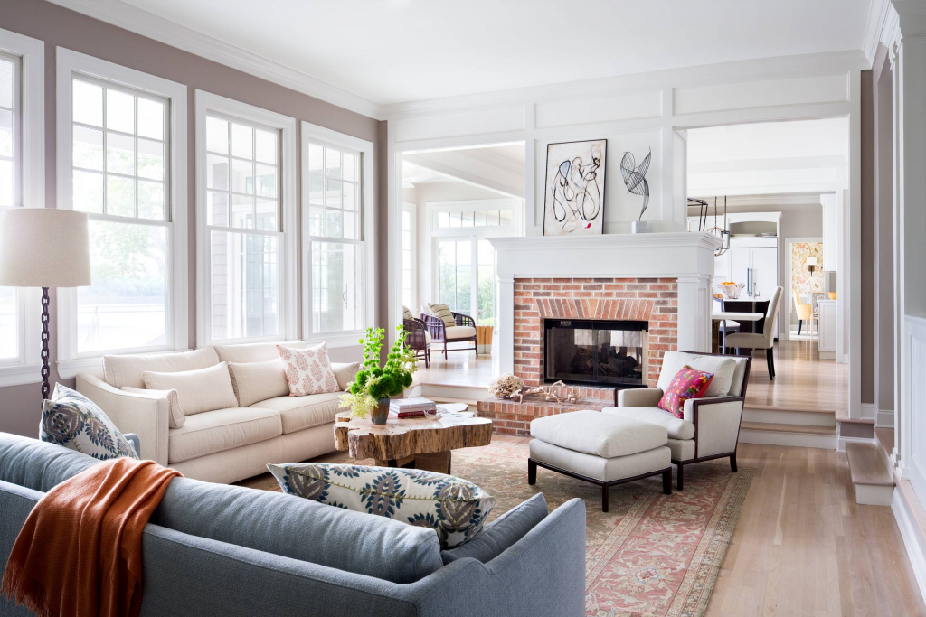 Белая гостиная также не должна производить впечатление совершенно стерильной и безжизненной. Напротив, уместными будут кремовые цвета и оттенок слоновой кости, теплый беж и нежная карамель. Прохладные серые и голубоватые тона также не станут лишними в гармоничном интерьере. Главная особенность стиля – использование сложных многогранных цветов, которые состоят из нескольких разных оттенков.