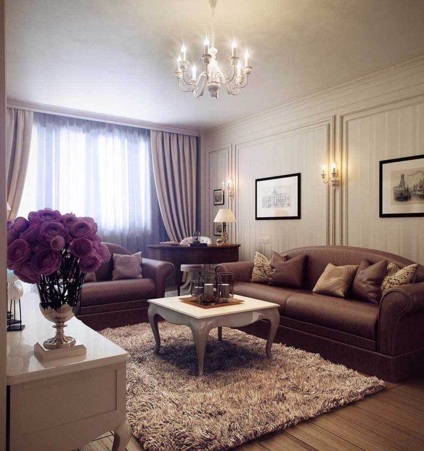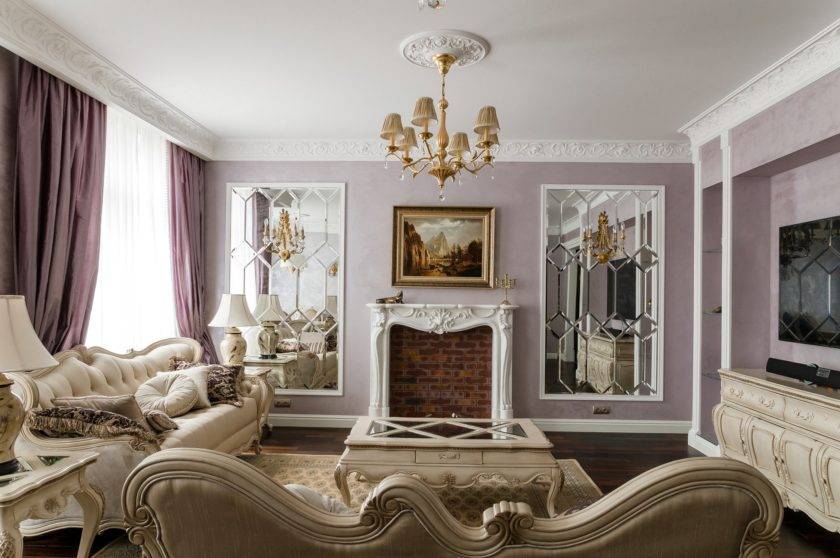 Мебель должна быть выполнена из натурального дерева. Стены допускается украшать зеркальными полотнами, оформленными в рамы из дерева, классический багет или лепнину. Гостиную в классическом стиле украшать следует натуральными камнями и дорогими тканями.