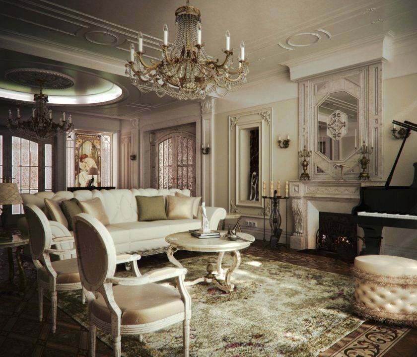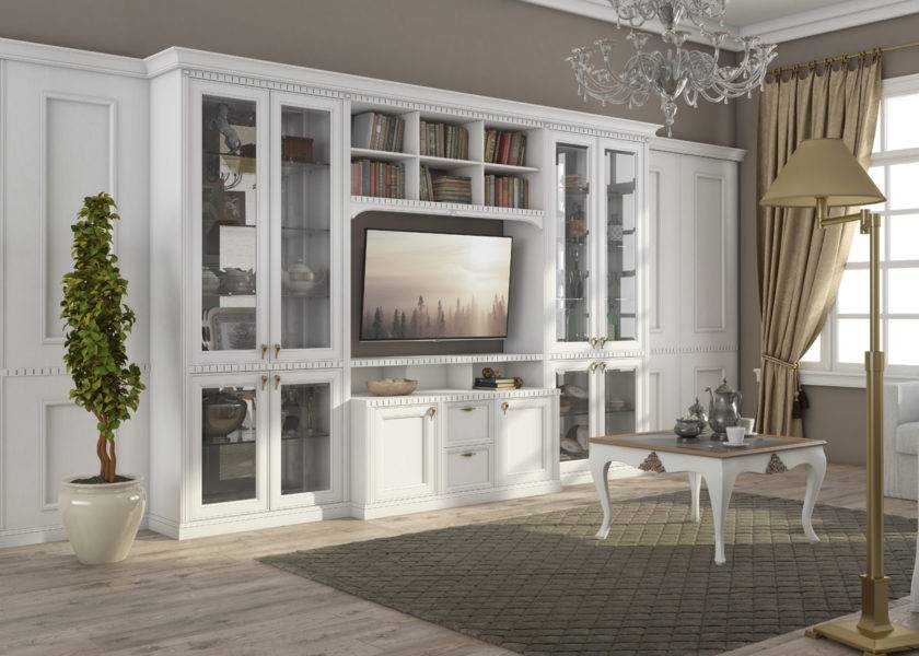 Классический. Вся мебель в этом стиле изготовлена из качественных, натуральных материалов, к примеру, беленого дуба. Гостиная имеет презентабельный, богатый вид, смотрится очень современно. Идеально дополняют белую мебель аксессуары, различные элементы из бронзы, позолота, натуральной кожи.