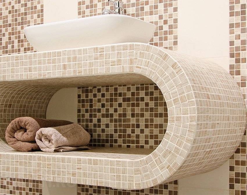 - Мозаика хорошо укладывается на плоские и изогнутые стены. Также можно отделывать поверхности сложной формы — цилиндрические, сферические, криволинейные. С ее помощью удобно облицовывать участки нестандартных форм.