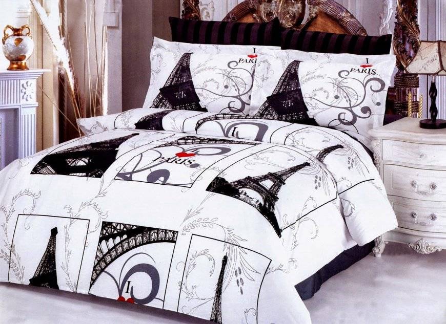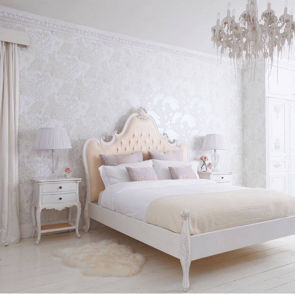 Белая мебель хорошо вписывается в стилистику французской провинции. Для создания нежной обстановки подойдут однотонные обои или с мелкими цветочными мотивами. Эти два варианта можно сочетать между собой, выделив цветочным принтом определенную зону в спальне.