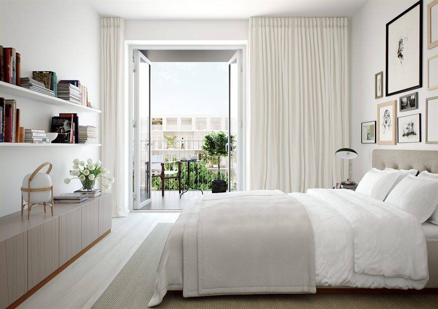 Акценты в спальне: с белой кроватью, обои, шторы, аксессуары
