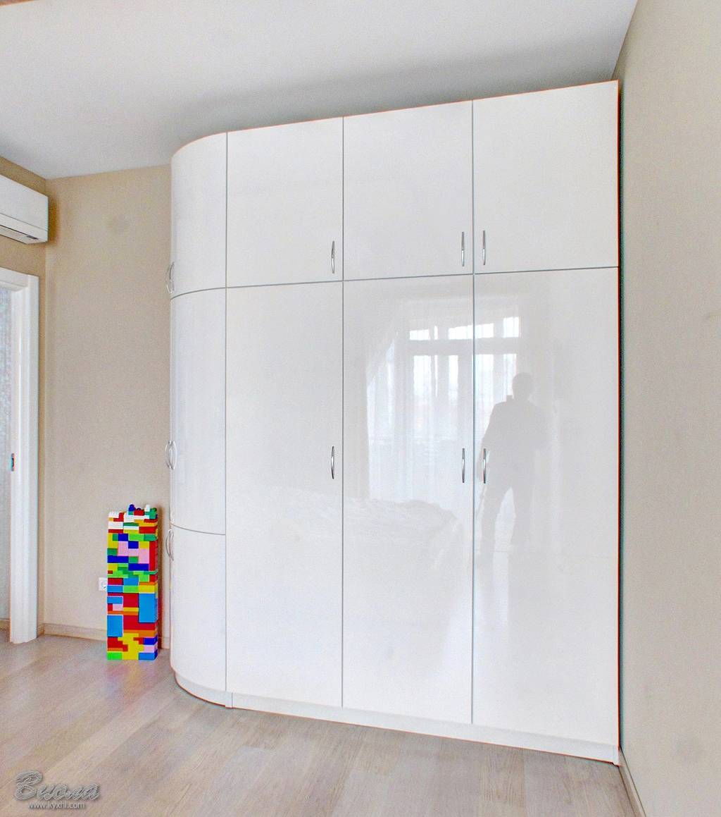- угловые модели для небольших помещений в состоянии обеспечить вместимость и эргономичность, сравнимую с обычным двух- или даже трехстворчатым шкафом, а глянцевые белые панели создадут в небольшом помещении яркий цветовой акцент,