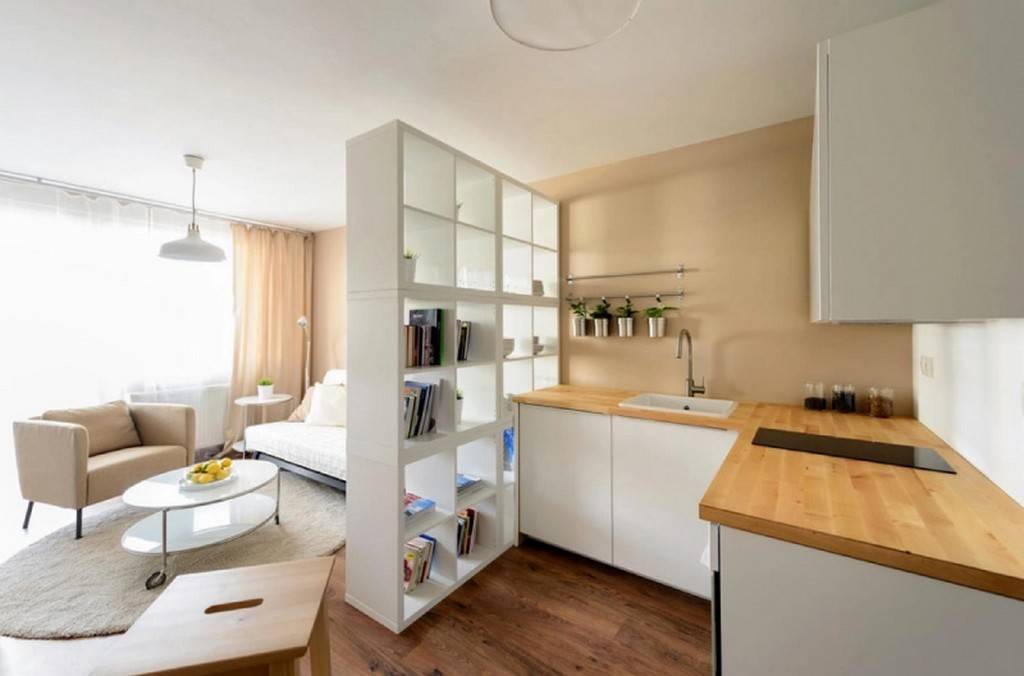 В небольшой квартире-студии хочется выделить угол под полноценное спальное место или как-то отделить зону отдыха от зоны кухни. Высокая полка идеальна для зонирования.