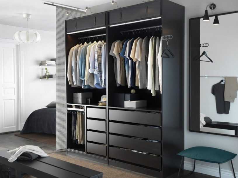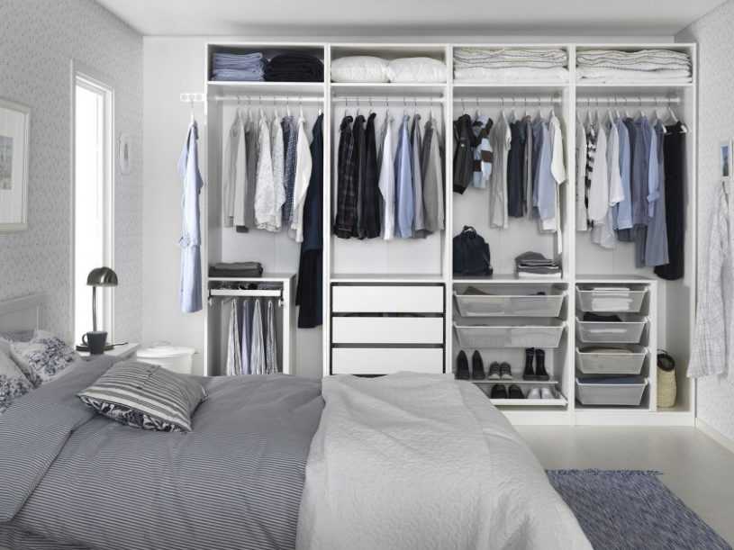 Минимальная ширина комбинации шкафа-купе «Пакс» — 150 см. На такой площади располагаются два отсека со штангами для хранения вещей на вешалках и достаточно большое количество полок или контейнеров для хранения вещей в сложенном виде.