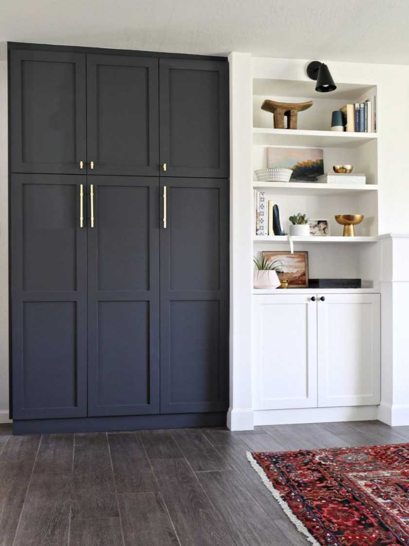 Преимущество закрытых книжных шкафов с глухими дверцами – возможность быстро прибраться, скрыть беспорядок и не заморачиваться с декором.
