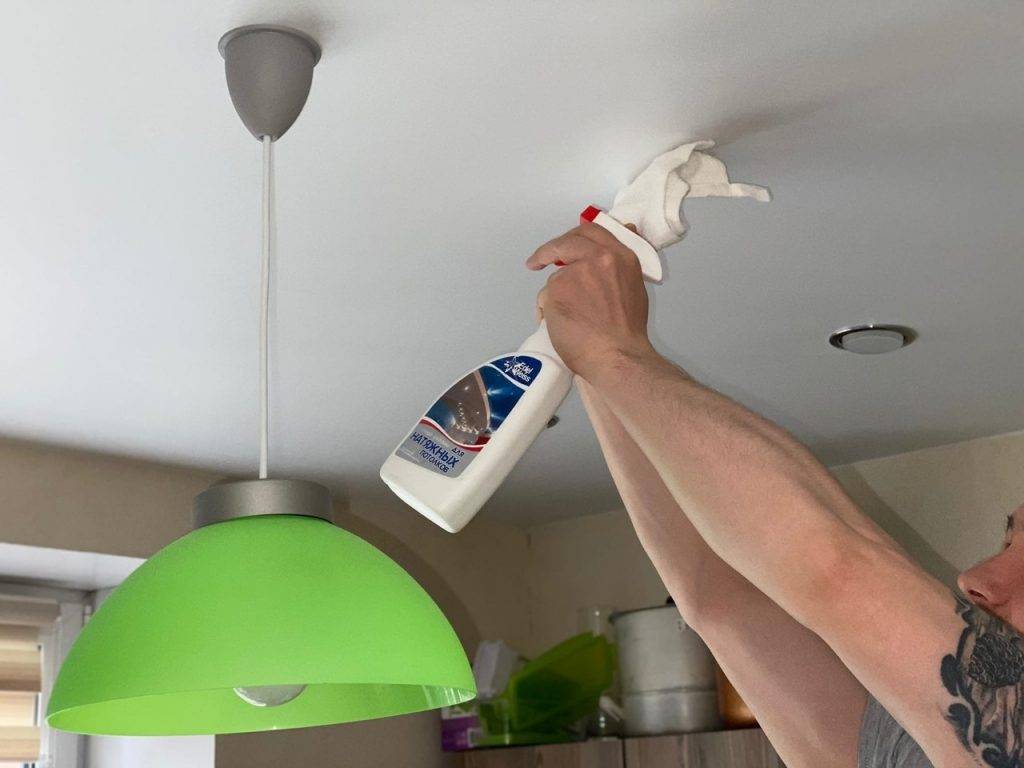 - На белых потолках сильно заметны любые виды загрязнений, пыль, следы от случайных механических повреждений. Лампы накаливания, установленные в потолочных светильниках, со временем нередко оставляют тёмные пятна из-за повышенной температуры.