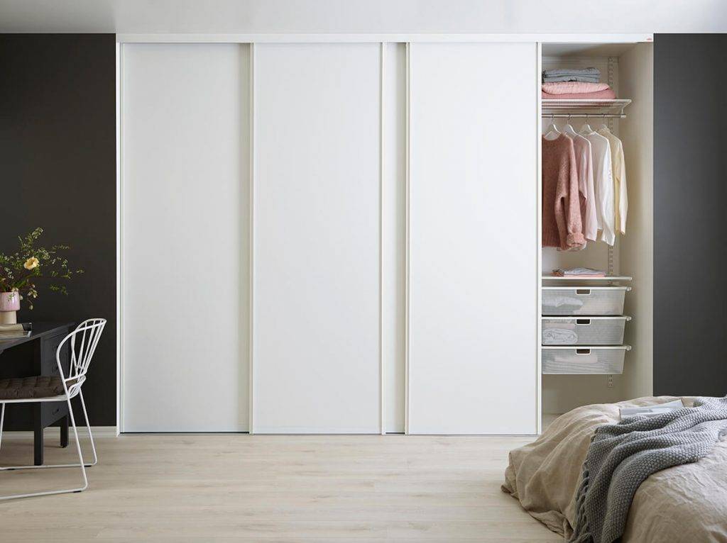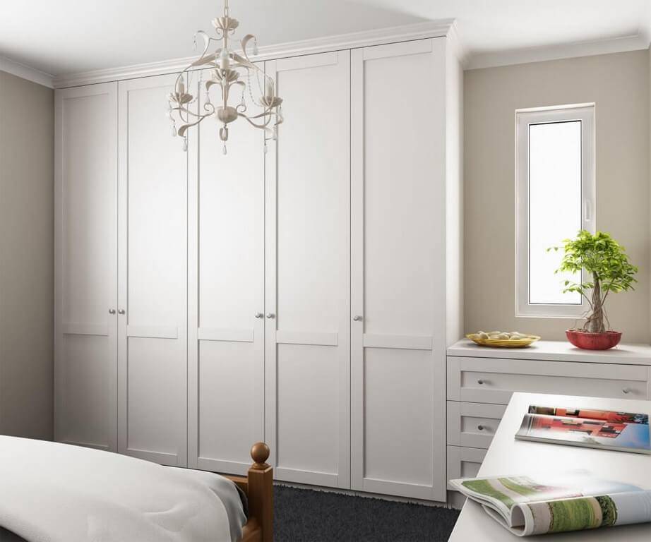 В большую комнату хорошо впишется белый трехстворчатый корпусный шкаф. В маленькую лучше выбрать компактный вариант. Встроенный шкаф — самый удачный выбор для ограниченного пространства. Это мебель без задней стенки, размером от пола до потолка. Такие модели дешевле, компактнее и установить их можно в любой части комнаты.