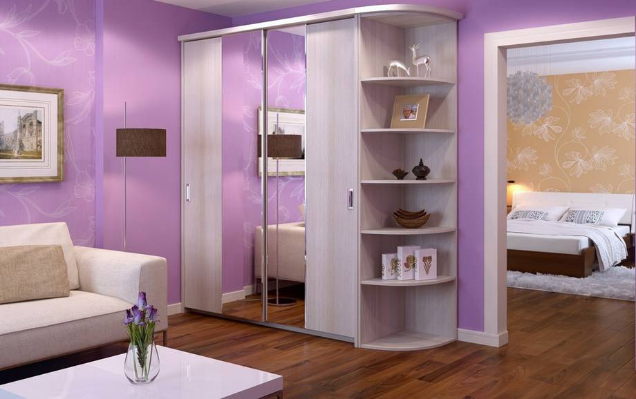 Для зала в современном стиле можно применить радиусный гардероб. Это мебель с плавными изгибами. Ее дверцы перемещаются по изогнутым в нужную форму рельсам. Оригинальная конструкция отлично впишется в нишу или угол, зрительно скроет недостатки планировки.