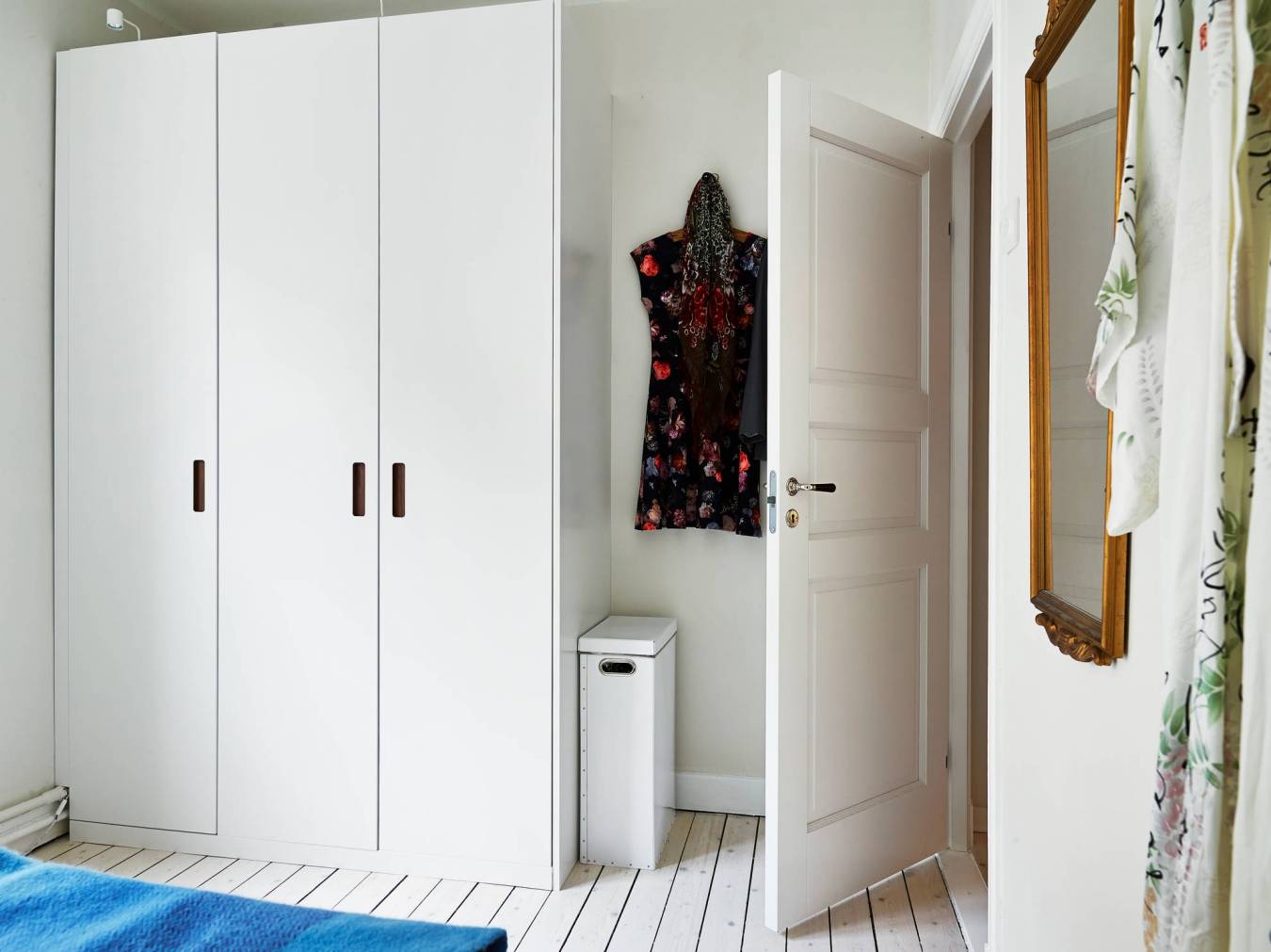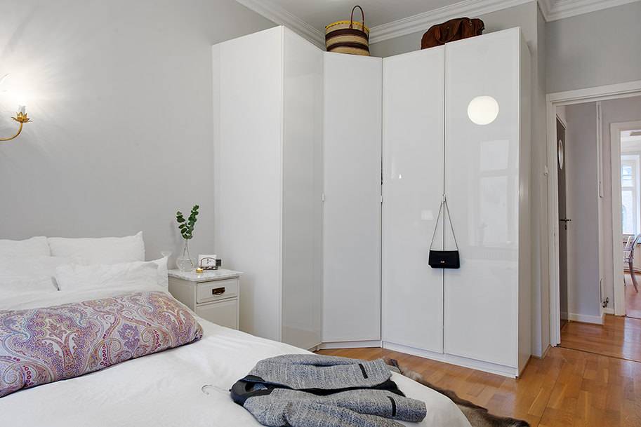 В большую комнату хорошо впишется белый трехстворчатый корпусный шкаф. В маленькую лучше выбрать компактный вариант. Встроенный шкаф — самый удачный выбор для ограниченного пространства. Это мебель без задней стенки, размером от пола до потолка. Такие модели дешевле, компактнее и установить их можно в любой части комнаты.