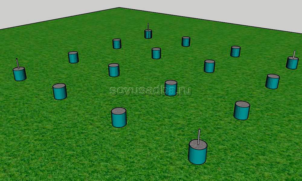 Бурить скважины нужно на пересечении линий. То есть, получится целых 16 штук. Для Подмосковья углубиться нужно на 1400 мм, для других регионов отметка будет другой и зависит от уровня промерзания почвы в регионе. Идея в том, чтобы только не допустить промерзание земли под подошвой сваи, ведь от касательных усилий пучения опоры защитит сам ПВХ тубус.