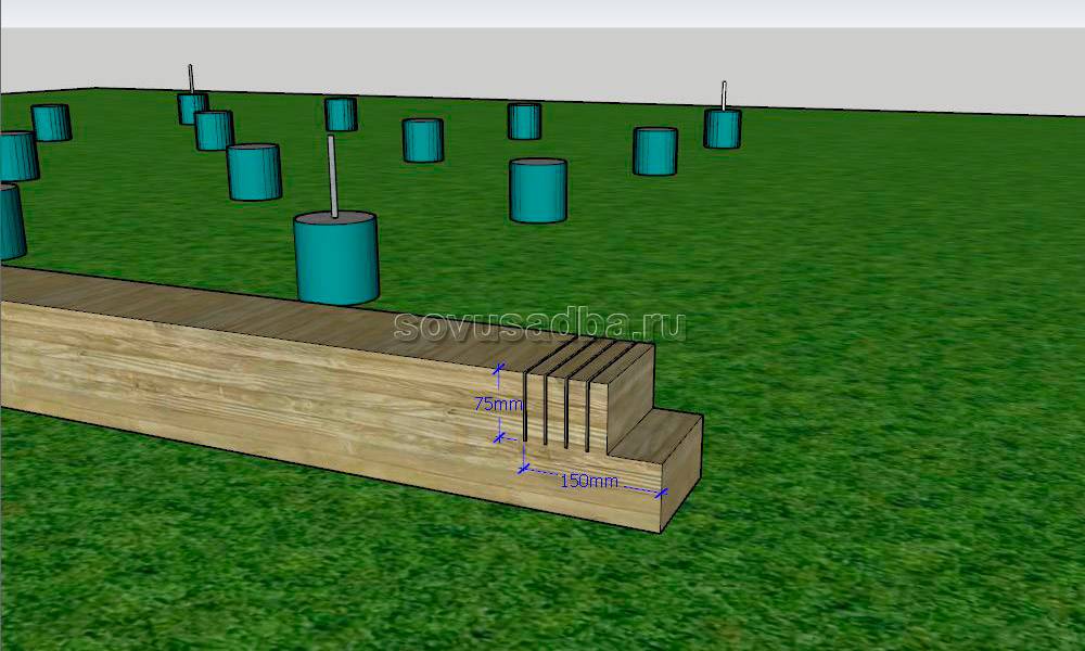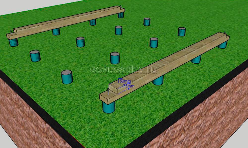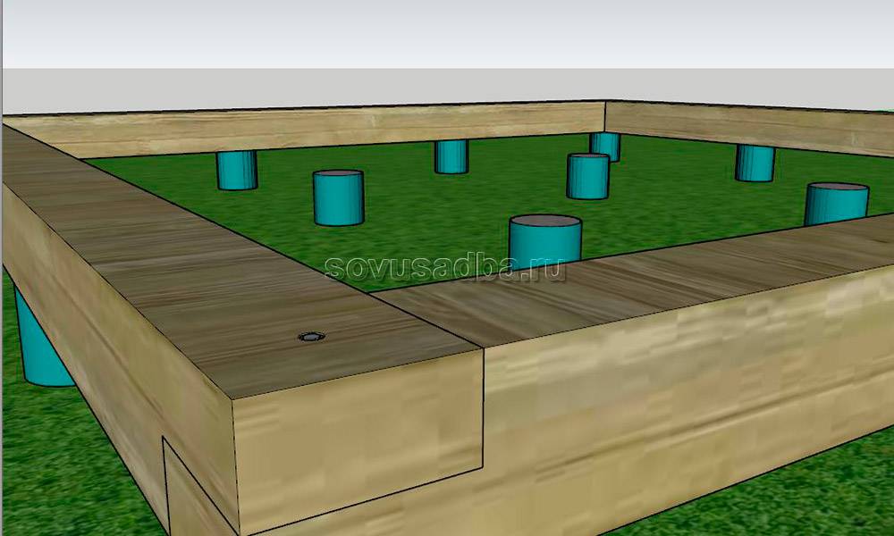 Деревянная рама, на которой собирают каркас при использовании свайного фундамента, поднимается над землей на высоту от 20 до 50 см. Это гарантирует хорошую вентиляцию – главное условие долговечности древесины.
