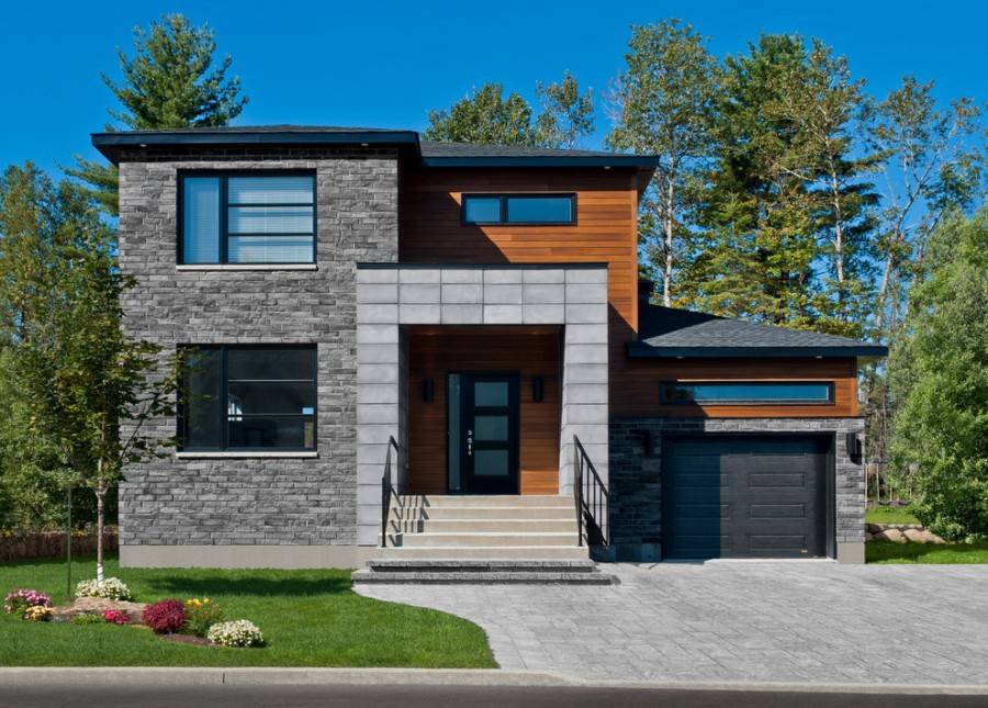 Двухэтажный дом, с гаражом на первом этаже смотрится солидно и оригинально, дополнительное оформление и обустройство подъездной дорожки дает возможность подчеркнуть уникальность ландшафтного дизайна.