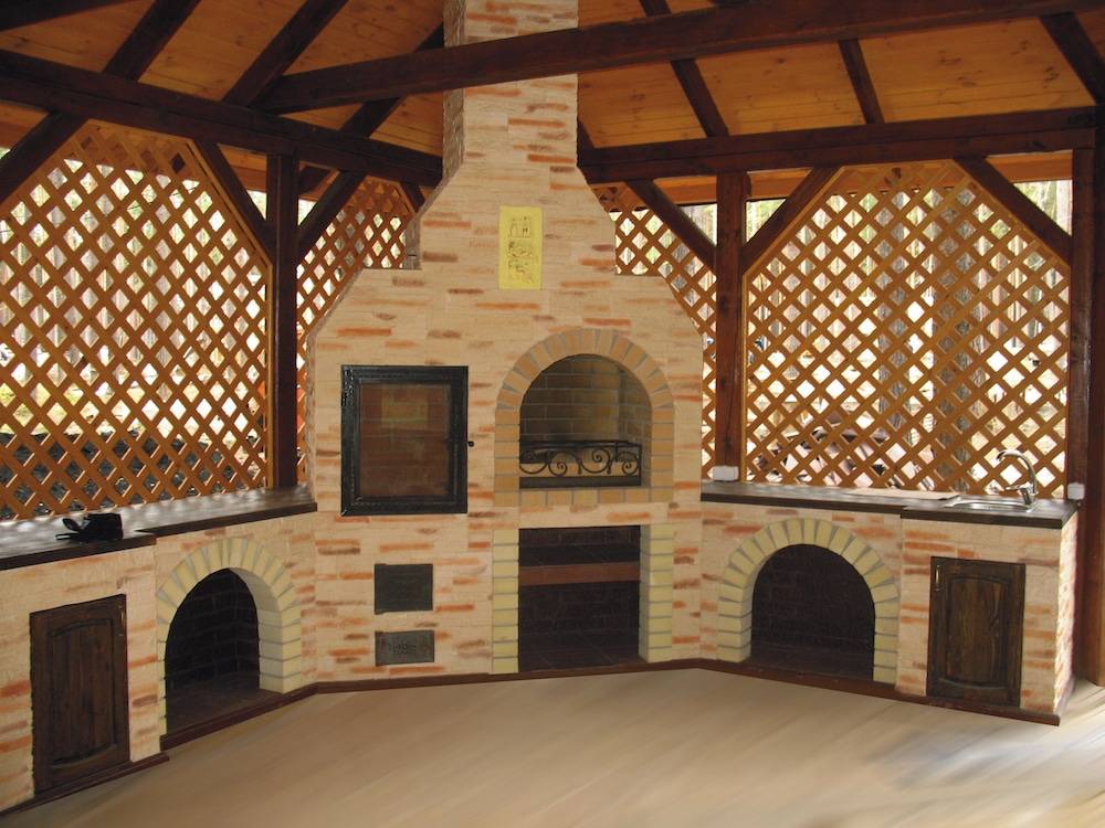 - стационарный — включает барбекю и плиту, сразу устанавливается на определенном участке и крепится посредством фундамента;