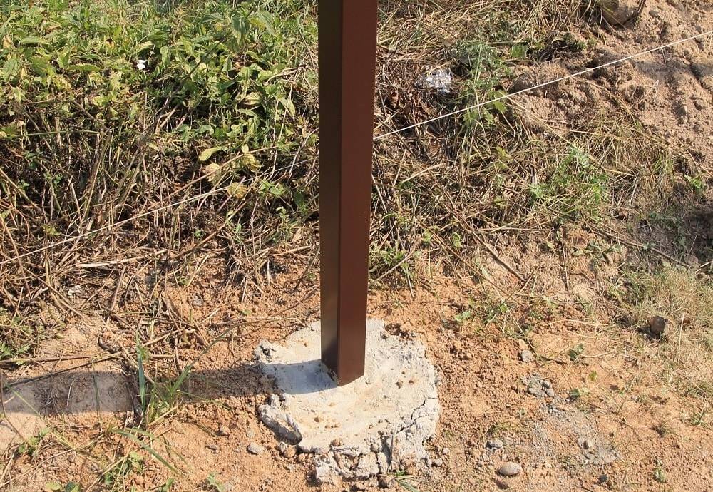 Для надёжного вкапывания опорных столбов нужен щебень и песок — они послужат для уплотнения, поэтому следует заложить на дне по 10 сантиметров и первого, и второго. Каждый слой поливается и тщательно трамбуется. Сверху лунок необходимо залить бетон, проверив вертикальность установки отвесом до того, как раствор успеет схватиться. Под тяжёлые и высокие ограждения потребуется заложить сплошной фундамент.