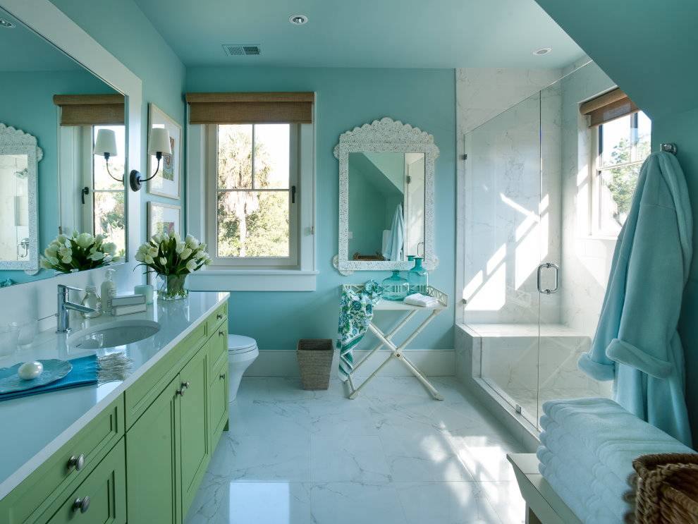 Нежно-бирюзовый цвет в ванне гармонично смотрится в классическом, современном и морском стиле. Полезные предметы с морской тематикой удачно дополняют дизайн. Учитывая, что в стандартных городских квартирах ванные комнаты небольших размеров, бирюзовый цвет лучше комбинировать со светлыми оттенками.