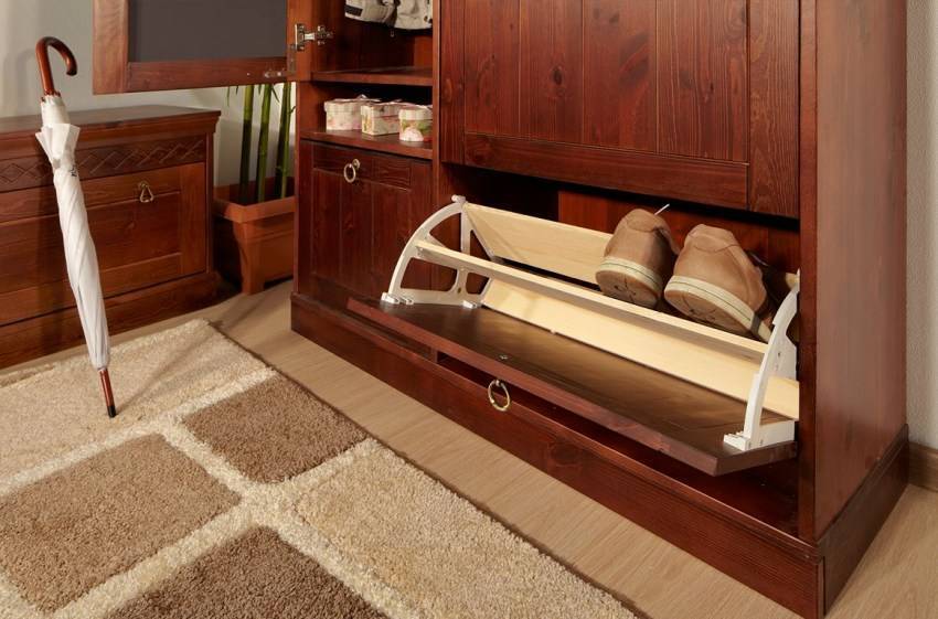 Следующий вариант разновидности шкафов – модель со специальным местом для сидения. Этот вариант хорош собой, ведь представляет удобный диванчик, где можно не обуваться, просто присесть, отдохнуть. Выбирая модель с открытыми полками необходимо навести полный порядок. Ведь содержимое будет видно как членам семьи, так и гостям.