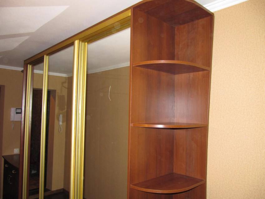 К недостатку такого решения заполнения угла относится то, что внутрянка шкафа (полки) делается в виде треугольников. Это вызывает некоторые неудобства при заполнении объёма секции постельными принадлежностями и другими предметами.