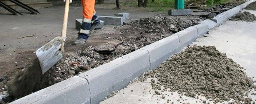 На въездах и входах бордюрный камень укладывают на большую глубину, что исключает создание препятствия. На дорогах конструкционный элемент устанавливают на высоту камня. Ширина траншеи должна быть на 5-7 см больше основания бордюра.