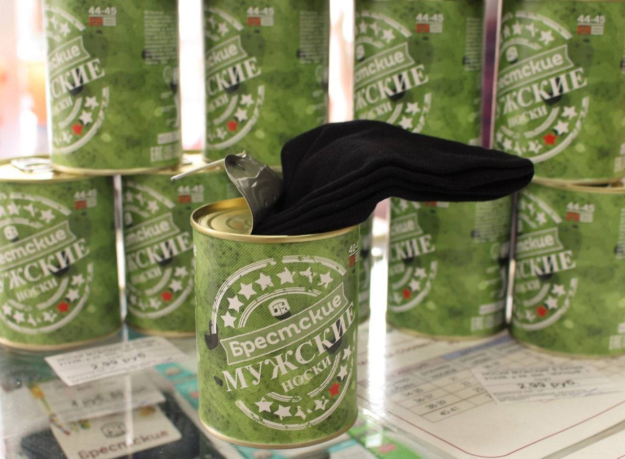 Консервы с носками, это креативный подход брестских производителей чулочно носочных изделий пользуется популярностью среди любителей приколов и небольших розыгрышей. Такой недорогой сувенир из Беларуси, станет великолепным подарком для коллеги по работе. Цена вопроса от 150 рублей.