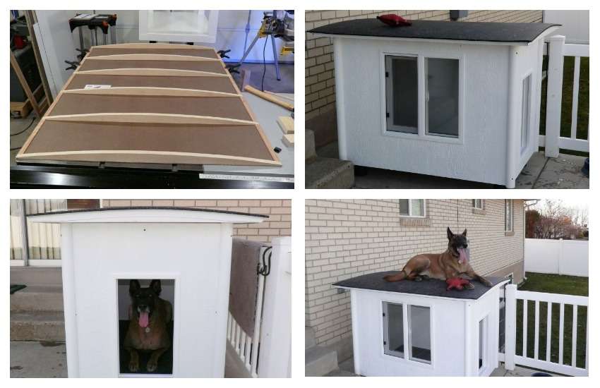 В передней стенке прорезается лаз 40-50 см на 50-60 см. Конструкция крыши чаще односкатная, так как сторожевые собаки любят запрыгнуть наверх и охранять вверенную им территорию свысока. Если пристроить к домику лесенку или горку, получится хороший тренажер для активных упражнений.