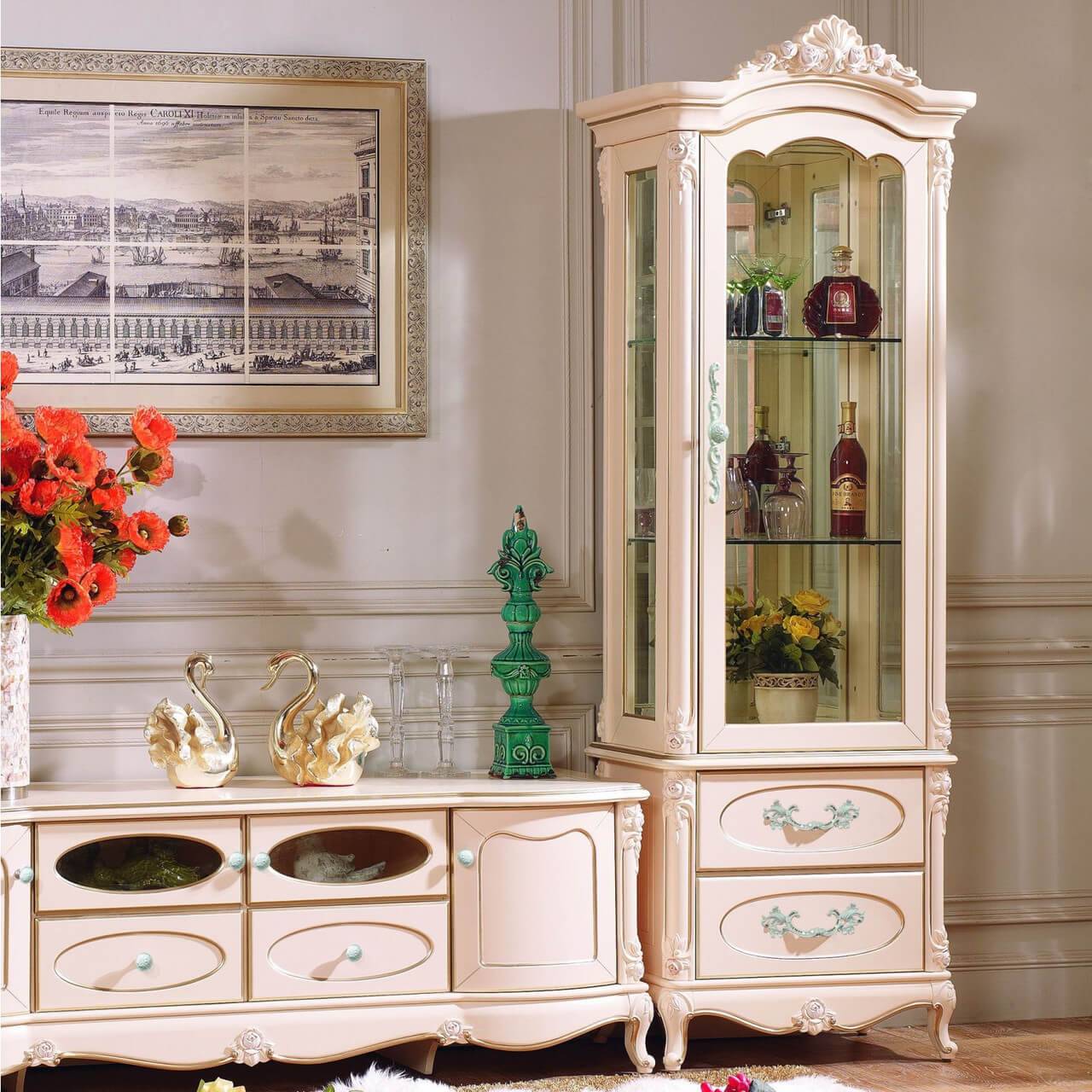 - Прованс. Сюда лучше всего подойдет резной или стандартный сервант белого цвета. Атмосферу французской деревни отлично подчеркнут изысканные мелкие детали: дверные ручки с эффектом старины, подвесками, камеями.