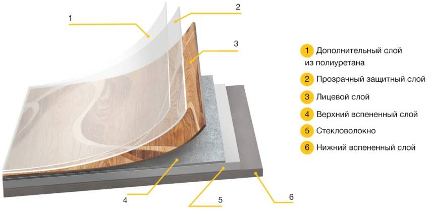 Толщина бытового линолеума варьируется от 1,5 до 4 мм. Верхний слой – транспарент, — формируется из гибкого полиуретана. Некоторые производители добавляют специальные слои, обеспечивающие бактерицидные свойства поверхности, упрочняющие и проч.