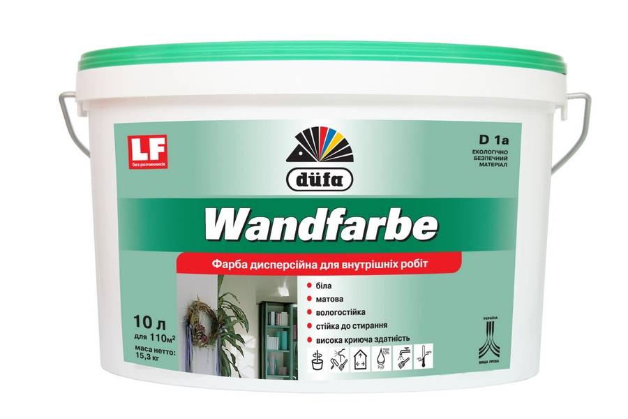 - полиакрилата (акрила): мягкого эластичного полимера, образующего на поверхности тонкую эластичную пленку; краска обладает хорошей укрывистостью, ложится ровным слоем; стены и потолки, покрытые ею, допускается протирать влажной тряпкой; такую водоэмульсионку также можно разбавлять водой;
