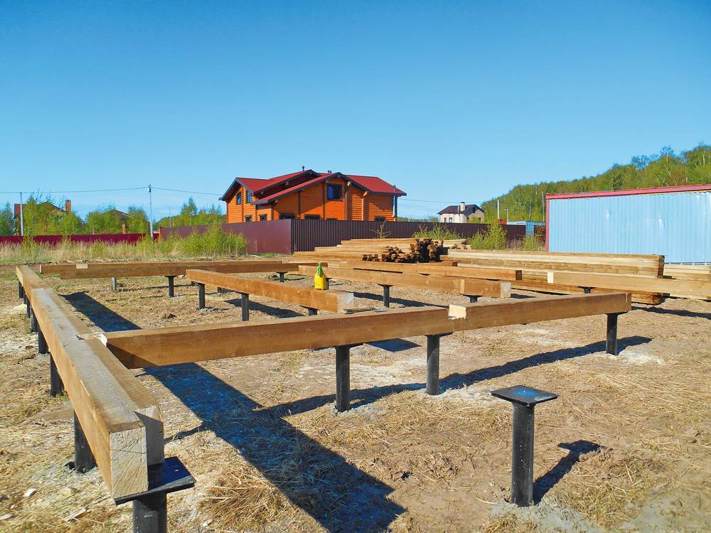 - Свайный фундамент с брусом 200*200 для обвязки;