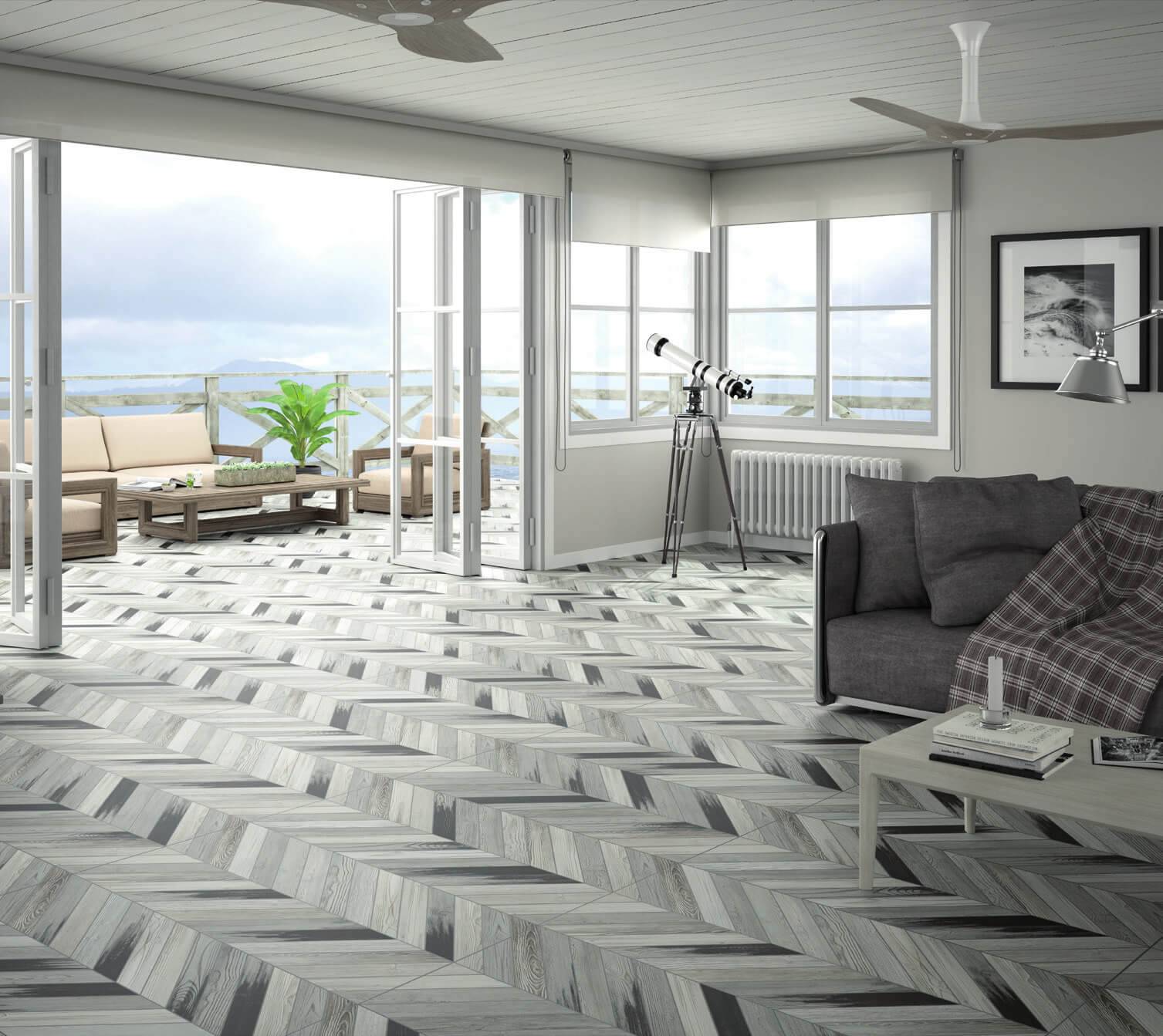 Плитку можно использовать во всех «трудных» пространствах: под столом и стульями, где из-за постоянного движения мебели быстро изнашиваются деревянные панели, а также вокруг камина, где температура меняется и может быть высокой. Более того, под плитку может быть использован пол с подогревом.