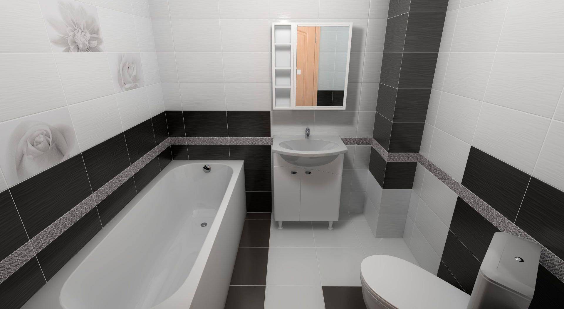 - Классический. В этом случае часть стены выкладывается одним цветом, а часть другим. Это может быть разделение по горизонтали или вертикали. Сейчас популярно подчеркивать более активным цветом (в вашем случае черным) зоны в ванной: за стиральной машиной, над ванной, за раковиной или какие-либо другие места. Интерьер будет графичным, традиционным и строгим.