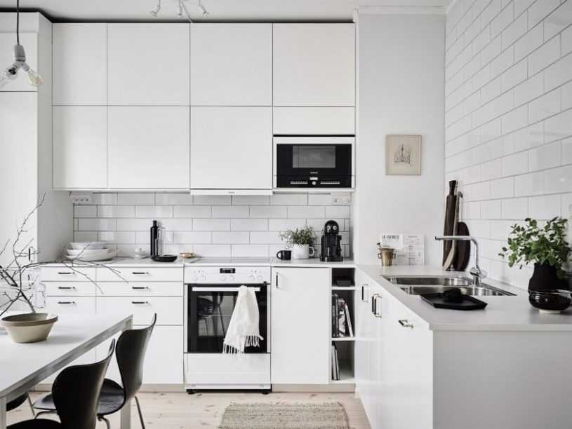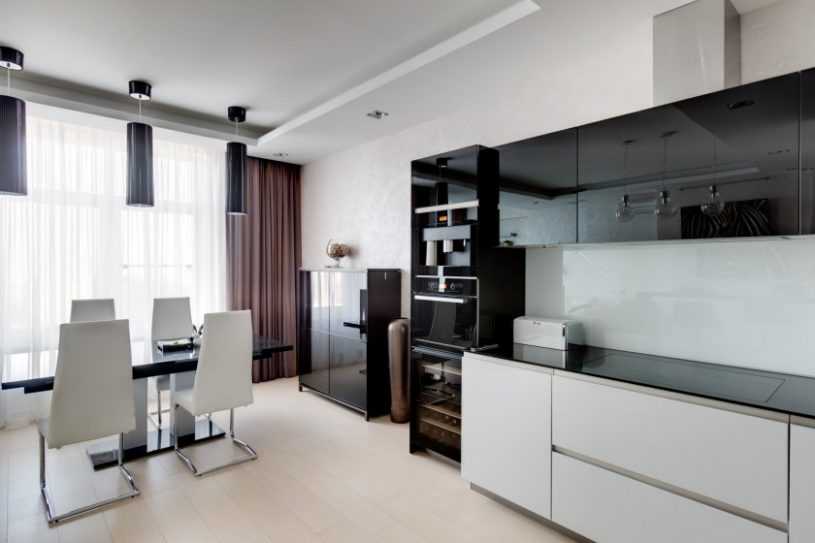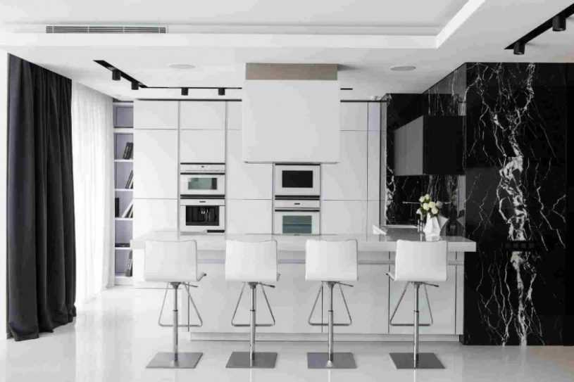 Просто сделать основным нужно белый, а черным – обыграть его. К примеру, белая кухня с черной техникой – классический прием. Более того, встроенная техника черного цвета требует куда меньше усилий в уходе, чем черные глянцевые фасады. Также отлично будет смотреться белая кухня с черным фартуком. Основной белый смягчит, а черный станет прекрасным акцентом для любой кухни.