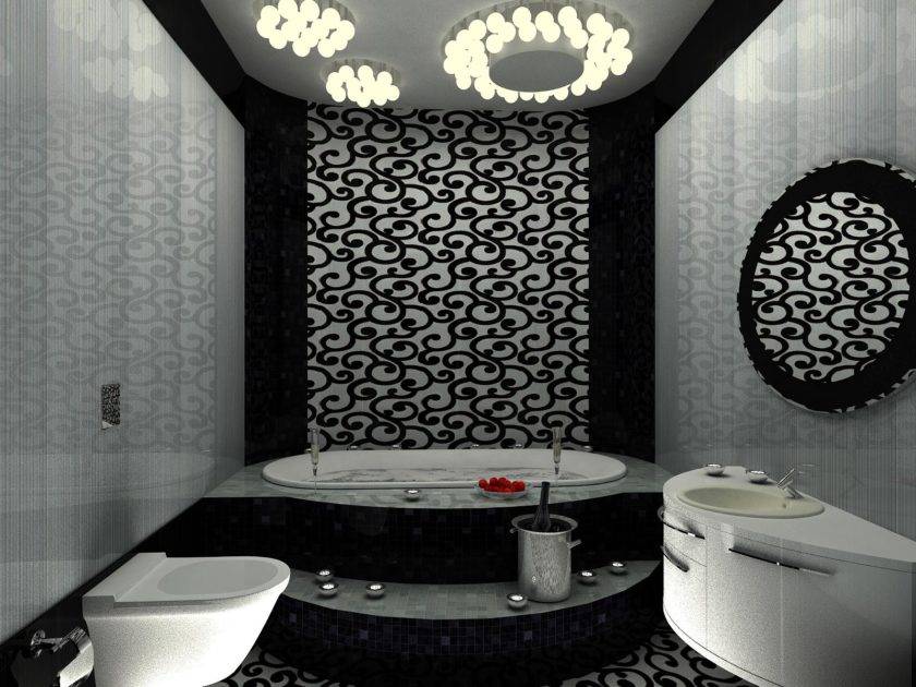Оригинально смотрится ванная, выполненная в «ажурном» оформлении. Монохром в виде узоров равномерно распространяют по помещению. Доминирующий тон выбирают в зависимости от размеров пространства. Часто переходы между цветами заполняют родственным оттенком: