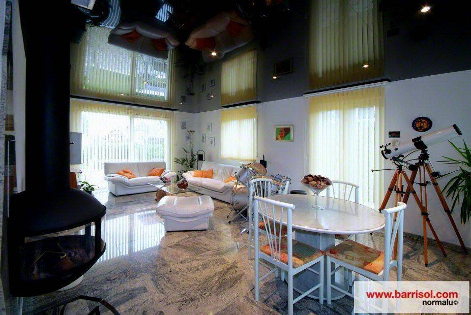 Глянцевый натяжной потолок чёрного цвета – это дешёвый и простой аналог зеркального потолка. Именно у чёрного полотна самая высокая отражающая способность