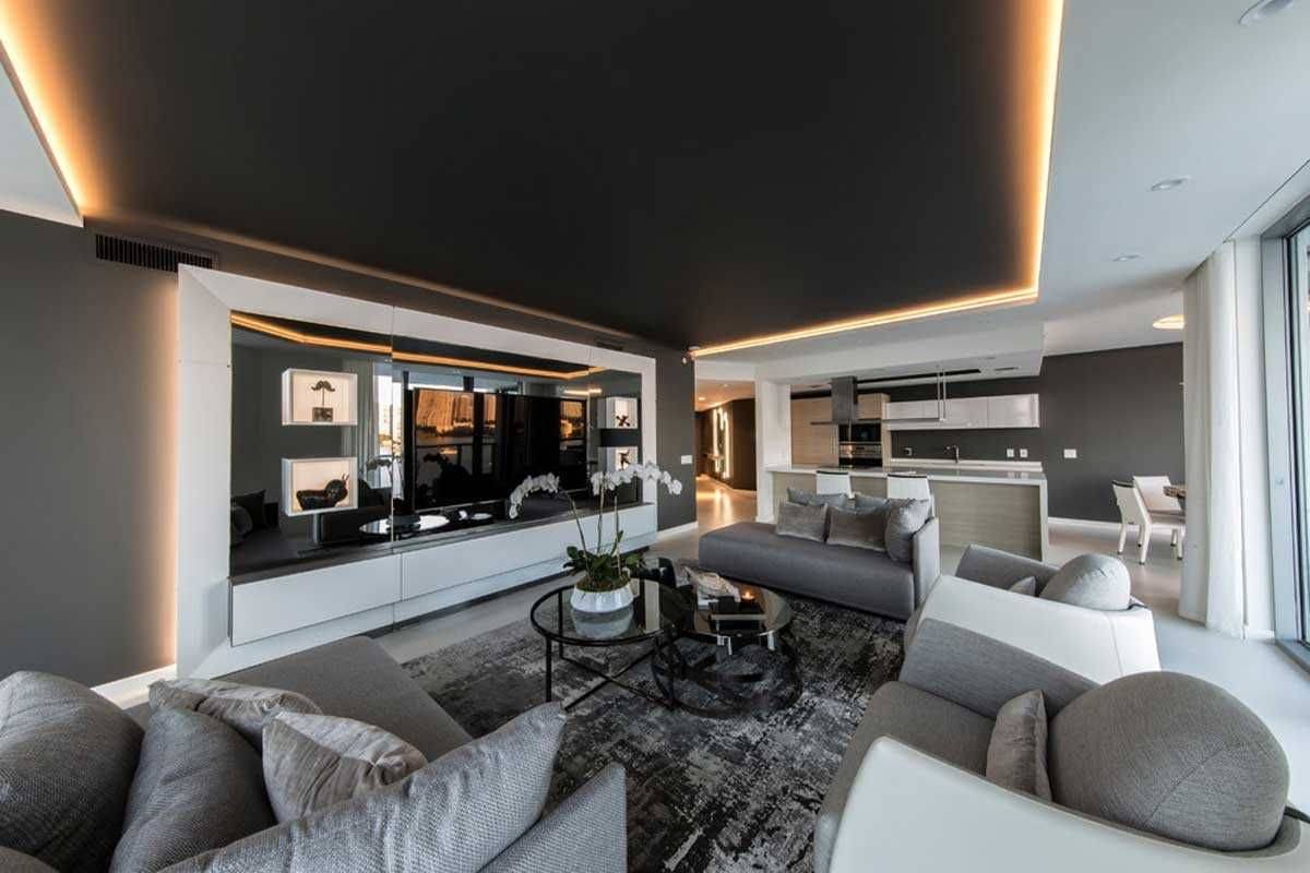Матовый потолок внешне, практически никак не отличается от качественной покраски. Единственный недостаток заключается в том, что уровень потолка немного опустится. Если применяется многоуровневая конструкция, то один уровень можно сделать чёрным, как на примере.