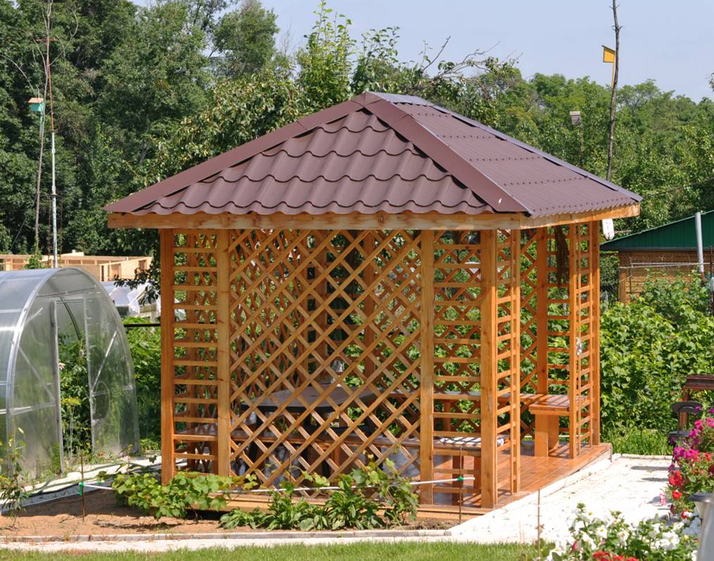 Подыскивая, чем покрыть беседку, основывайтесь на преимуществах легких материалов. Современные производители предлагают: