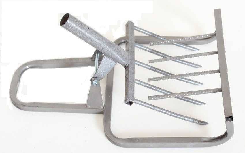 - К нижней части ножек на таком расстоянии от перекладины в опорной рамке, чтобы основные вилы двигались свободно, приваривается вспомогательная планка со штырями.