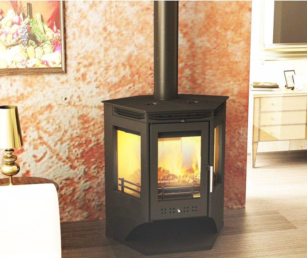 Стоимость агрегата равна 52 тыс. руб. в среднем, мощь составляет 12 кВт, тепловые возможности равны 120 кв. м. при весе в 165 кг. Примечателен способ остекления створок (панорамный тип), который придает эстетичный вид печи и комнате в целом. Экземпляр углового типа (размещается строго в углу комнаты), дизайн корпуса имитирует поверхность традиционных каминов. Также, как и створки, побочные стороны оснащены стеклом, устойчивым перед воздействием огня. Производитель снабдил модель универсальным типом установки трубы для отвода дыма. Благодаря форме корпуса, этот экземпляр допускается к установке не только в углу комнаты (в порядке исключения). Отделка камеры не подвергается вредному воздействию огня, благодаря специфике материалов. Хотя аппарат отечественный, комплектующие при изготовлении закупаются зарубежные и технологии производства соответствуют стандартам качества в полной мере.