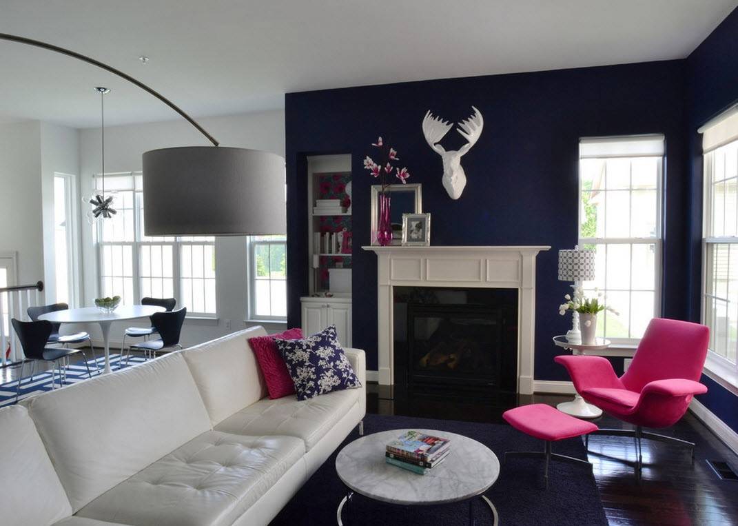Если вы хотите использовать розово-пурпурный в качестве акцента, обратите внимание на яркую мебель или декоративные светильники с металлическими цветными абажурами. В таком случае оформление стен должно быть максимально лаконичным. Для маленькой гостиной лучше выбрать приглушенный оттенок цвета, уходящий в теплую гамму