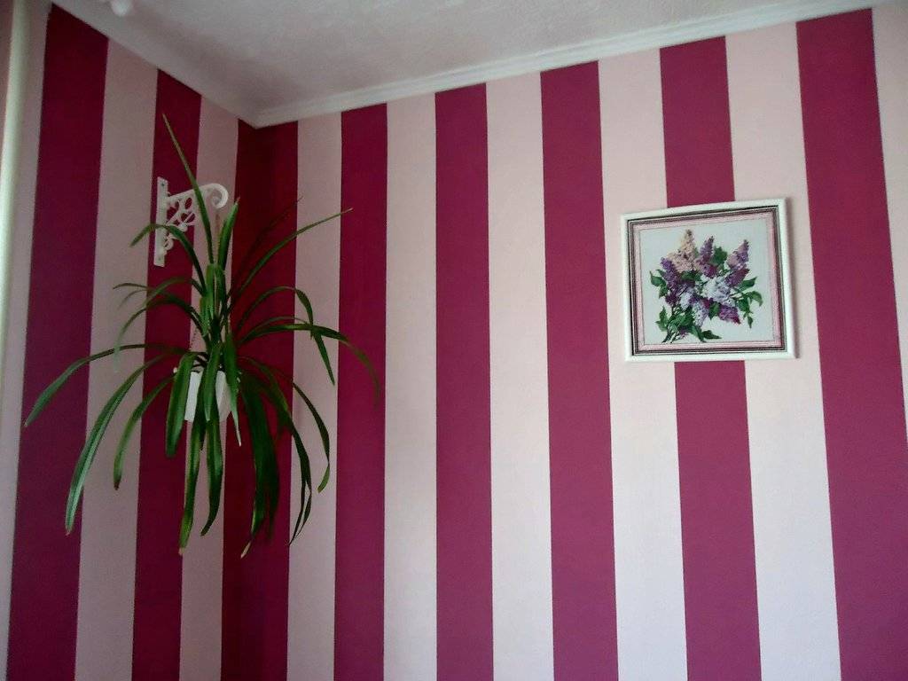В гостиной будут изысканно смотреться обои цвета фуксии с контрастными полосками. На таком фоне потолок должен быть белым или кремовым. Для оформления пола лучше выбрать натуральный тон, например, светло-коричневый, бежевый.