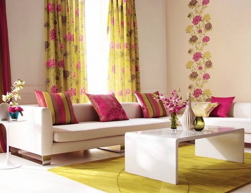 В классической бежевой гостиной уместным окажется текстиль (исключительно из натуральных материалов) контрастной цветовой гаммы: подушки, шторы, покрывала, накидки на кресла. Однако не менее интересно будут смотреться и различные орнаменты и принты.