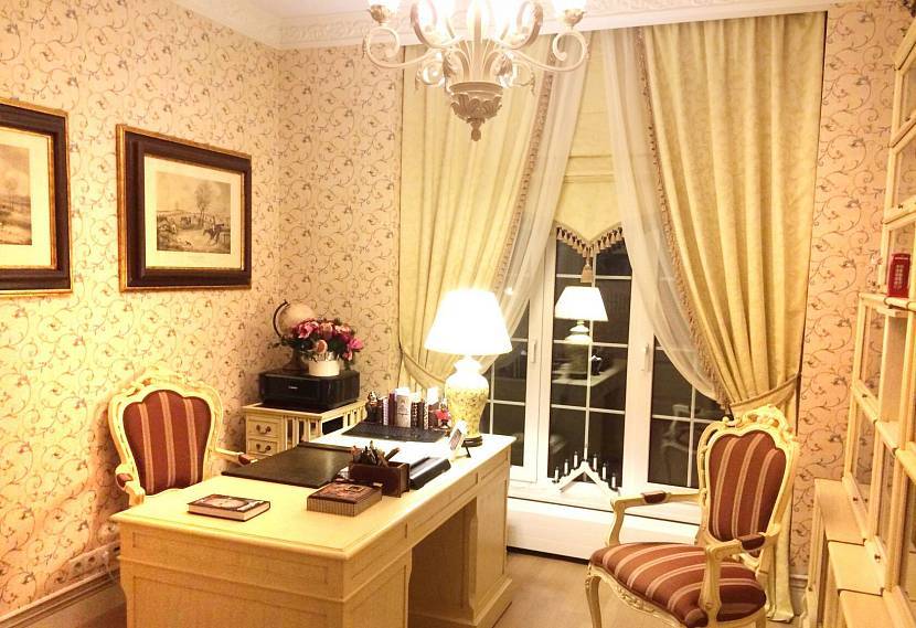 - Традиционную обстановку со стенами беж дополняют шторами кофейного, древесного и умеренно-шоколадного оттенка.