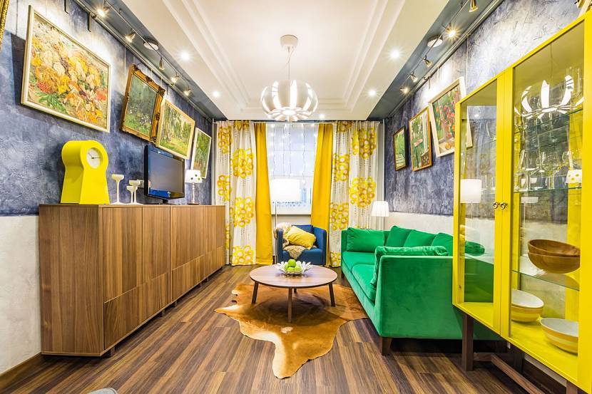 Дизайнерское направление приветствует использование сочных, ярких цветов. Бирюзовая спальня или гостиная гармонично сочетается с насыщенной желтой акцентной стеной. Вместо гардин уместны римские шторы в полоску (орнамент). На ткани рисунок повторяет оттенки оформления.
