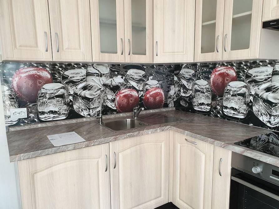 Важно, чтобы материал в районе фартука бал влагоустойчивым и жаропрочным. При этом отделка не должна впитывать влагу. В качестве декора применяются разнообразные сюжетные линии