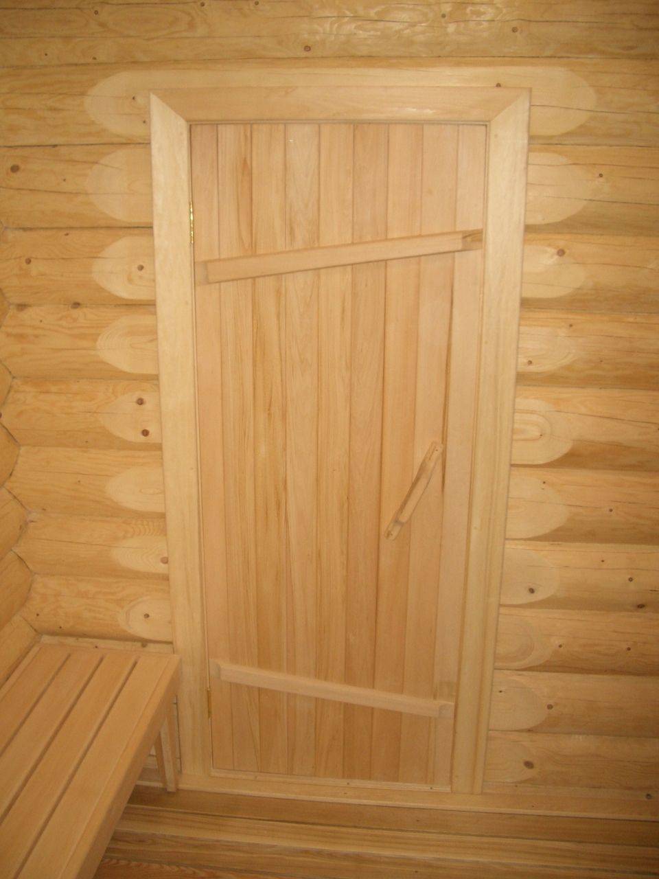 Деревянное дверное полотно для входа в парилку изготавливается преимущественно из лиственных пород, очень редко из обработанного кедра, практически никогда из молодых хвойных пород древесины. Никому не хочется касаться руками капель смолы и живицы, выпотевающей на деревянной облицовке при попытке открыть дверь и выйти из парного отделения. Поэтому изготавливают внутренние двери для бани из липы или осины. Более дорогие ясень и каштана идут на облицовку стен и изготовление деревянной мебели.